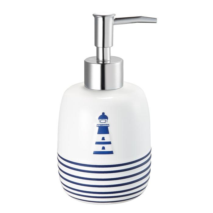 Дозатор выполнен в белом цвете из экологичных, нетоксичных, гипоаллергенных материалов. Простой дизайн и четкие графичные линии сделают его отличным дополнением к любой ванной. На корпусе нарисован небольшой стилизованный морской маяк темно-синего цвета.