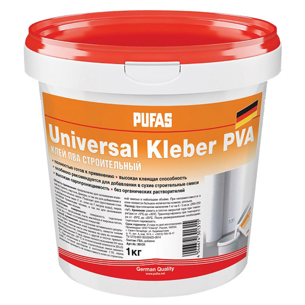 Клей ПВА универсальный Pufas предназначен для фиксации бумажных обоев, изделий из картона, фанеры и древесных плит. Подходит для предварительного грунтования стен перед оклейкой бумажными обоями при этом разбавляется водой в соотношении 1 кг клея на 7 литров воды, в остальных случаях используется без разбавления. Обладает высокой паропроницаемостью. Добавляется в строительные смеси при приготовлении растворов в качестве пластифицирующей добавки.1 кг клея хватает на 4—5 м2 поверхности.
