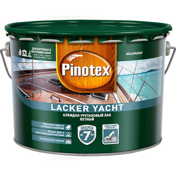 Pinotex Lacker Yacht 40 5255403 — алкидно-уретановый лак для наружных и внутренних работ. Обладает твердостью паркетного лака, грязе- и водоотталкивающими свойствами. Используется для обработки деталей лодок, яхт выше ватерлинии, защищая древесину от воздействия воды. Расход — до 15м2/л. После нанесения образует высокоэластичное гладкое покрытие, стойкое к перепадам влажности и температуры, а также моющим средствам. Подходит для поверхностей с умеренными эксплуатационными нагрузками (пол, ступени лестниц, перила). Легко разравнивается и не оставляет подтеков на поверхности. Объем — 1 литр.