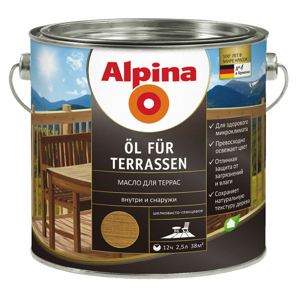 Alpina Ol fur Terrassen – масло для террас. Используется для обработки деревянных поверхностей снаружи и внутри зданий. Защищает древесину от влаги и загрязнений, освежает цвет, сохраняет естественную текстуру дерева. Отсутствие запаха обеспечивает комфортную работу. Шелковисто-глянцевое масло изготавливается на водной основе, отличается стойкостью к истиранию. Прозрачный цвет подходит для деревянных поверхностей любого цвета. Расход 65 мл/м2. Объем банки 2,5 л.