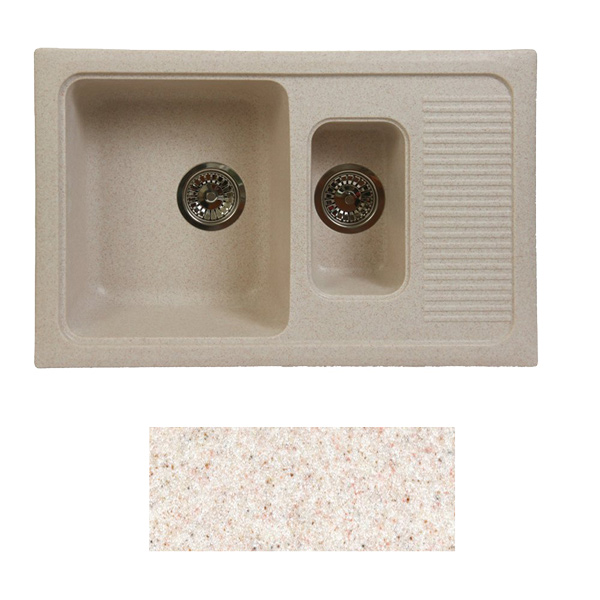 Кухонная мойка Fosto КМ 77-49 цвета Замороженный персик (№800) изготовлена из искусственного камня. Оборудована двумя прямоугольными чашами глубиной 17,6 см и 13 см. Размер мойки 76,3х48,5 см. Верхний защитный слой с антибактериальным покрытием не впитывает пыль и жир. Специальный состав камня не позволяет каплям воды растекаться на поверхности, обеспечивая высокую степень защиты от грязи. Для комфортного использования мойка оснащена поверхностью для сушки посуды. Поставляется в комплекте с сифоном.
