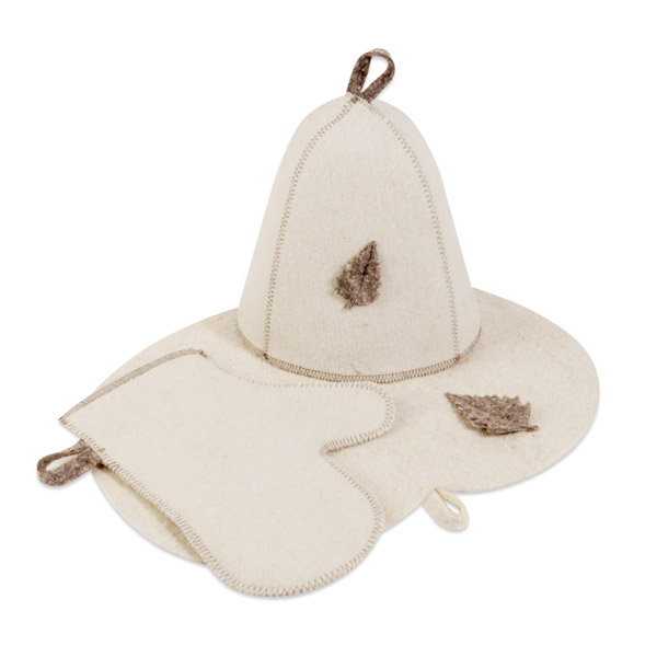 Банный набор Eva Б16 состоит из шапки, рукавицы и коврика. Комплект изготовлен из натурального материала, – белого войлока – декорирован аппликацией в виде листочка. Шапка закрывает затылок от пара, предотвращает сухость и ломкость волос. Коврик используется как салфетка для сидения, защищает тело от контакта с горячими полками. Рукавица обезопасит руки от горячего пара, соприкосновения с ручкой ковша. Все предметы набора имеют специальную петельку для подвешивания. Размер упаковки (ДхШхВ)—37x26x4 см.