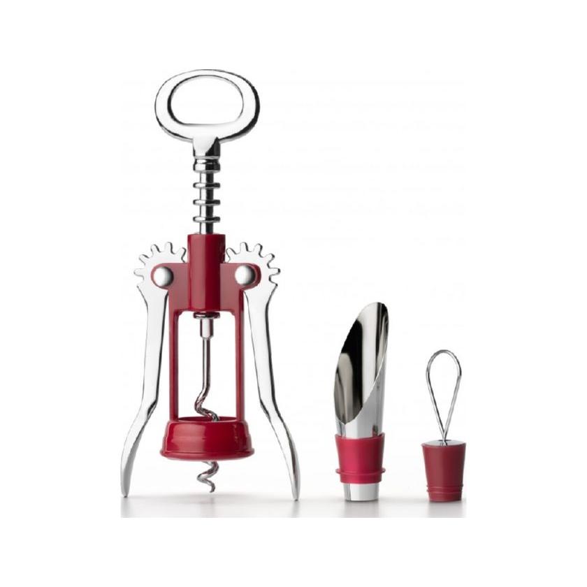 Набор состоит из трех предметов: штопора, пробки для временного укупоривания бутылок и каплеуловителя. Материал изготовления: штопор: нержавеющая сталь, цинковый сплав, пищевой пластик, пробка и каплеуловитель: нержавеющая сталь, силикон.