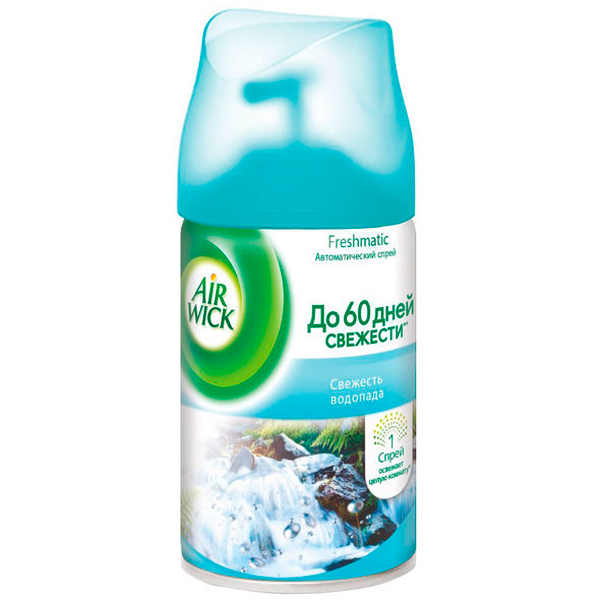 Освежитель воздуха автоматический AIR WICK Freshmatic Свежесть водопада 250 мл. Автоматический спрей, на котором можно регулировать интервалы между распылениями: 9, 18 или 36 минут, обеспечивая приятный запах в доме каждый день. В случае необходимости дополнительного распыления — нажать кнопку.