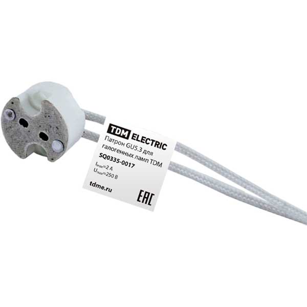 Патрон GU5.3 предназначен для галогенных ламп TDM SQ0335-0017 используется для комплектации светильников, люстр, конструкций световых подсветок. Корпус выполнен из керамики. Изоляция провода выполнена из текстиля – киперная обмотка с диагональным переплетением нитей. Сечение провода — 0,3 мм2. Длина провода — 120 мм.