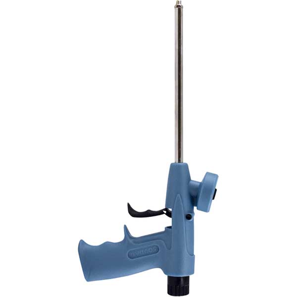 Компактный пистолет из пластмассы под полиуретановую пену в аэрозольной упаковке со стандартной резьбой.