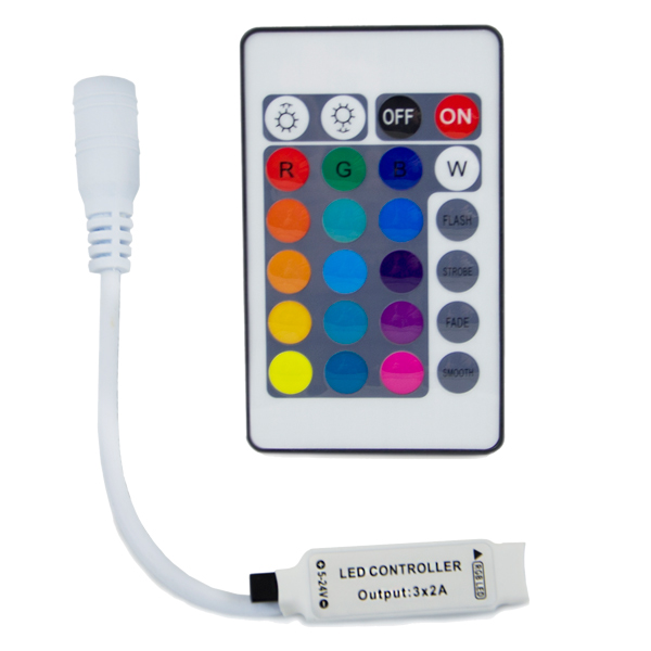 RGB-контроллер Apeyron 04-15 – элемент управления светодиодными источниками освещения. Служит для изменения цветовых эффектов. ИК-пульт с 24 кнопками помогает сменить расцветку освещения. Подходит для 5 -метровых лент мощностью до 7,2 Вт с напряжением питания 12 В. Один канал рассчитан на 2 А, общая сила тока 6 А.