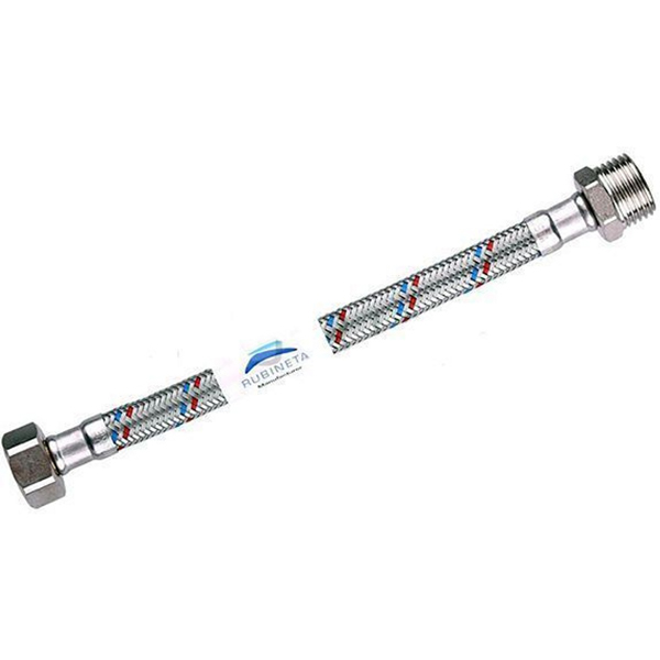 Rubineta 611080 — гибкая подводка для воды в оплетке из алюминия FIL-NOXГайка, ниппель (концевая арм-ра)-латунь покрытая никелем, резиновая трубка-нетоксичный этиленпропиленовый каучук, оплетка-сталь нерж.(алюм), раб. давление 20 атм, раб. температура-95 С, R min=65мм.