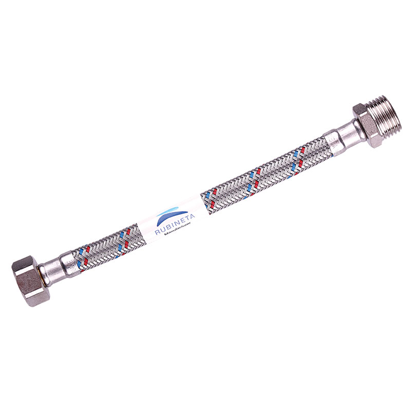 Rubineta 611100 — гибкая подводка для воды в оплетке из алюминия FIL-NOXГайка, ниппель (концевая арм-ра)-латунь покрытая никелем, резиновая трубка-нетоксичный этиленпропиленовый каучук, оплетка-сталь нерж.(алюм), раб. давление 20 атм, раб. температура-95 С, R min=65мм.