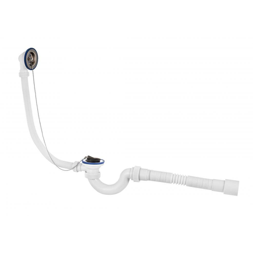 Сифон пластмассовый МИНИ Элит для ванн с нержавеющими чашками и гибкой трубой д.40/50 (654). Предназначен для ванн. Эргономичный сифон бутылочного типа с укороченным отстойником и гибкой трубой д.40/50.