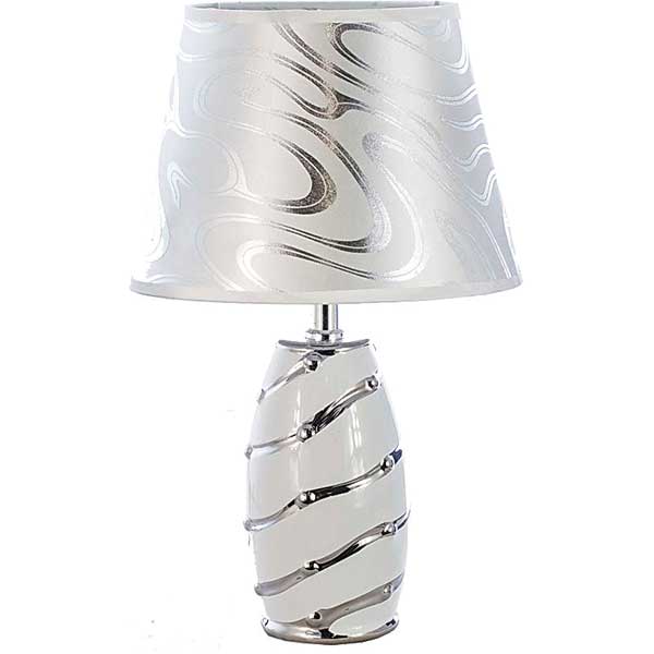 Светильник предназначен для освещения жилых помещений. Корпус – керамика. Цвет корпуса – белый-хром. Абажур – текстиль. Цвет абажура – белый, хром. Количество ламп – 1. Тип патрона – E14.