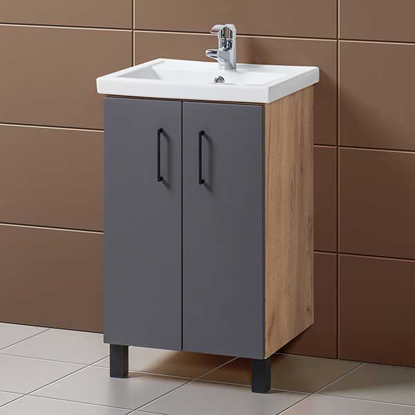 Каркас тумбы выполнен из ДСП цвета “Дуб Вотан” толщиной 16 мм. Фасад сделан из МДФ Пленка “Серый Супермат” толщиной 16 мм. Есть две распашные двери. Совместимый с тумбой умывальник: “Фостер 500”, ООО “Самарский Стройфарфор”.