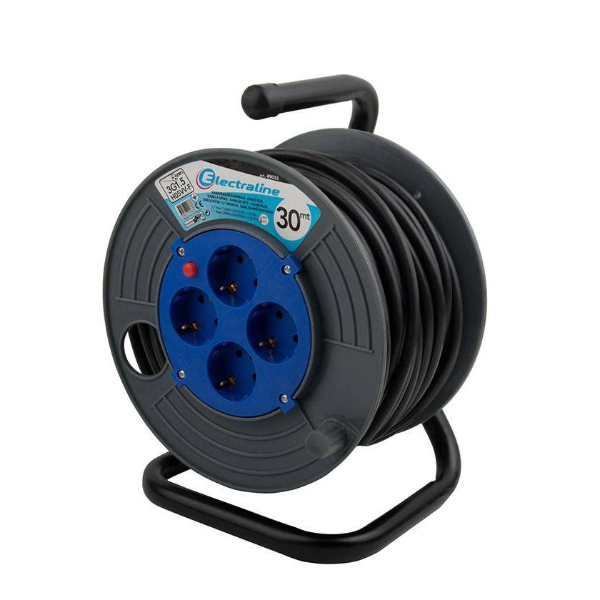 Удлинитель на пластмассовой катушке Electraline 49033 применяется для подключения электрических приборов вдали от розеток. 4 гнезда с заземлением выдерживают нагрузку 3200 Вт/16 А. Гибкий провод ПВС 3х1,5 мм2 длиной 30 м легко наматывается на катушку. Модель оснащена ручкой для удобной переноски и металлическим треногом.