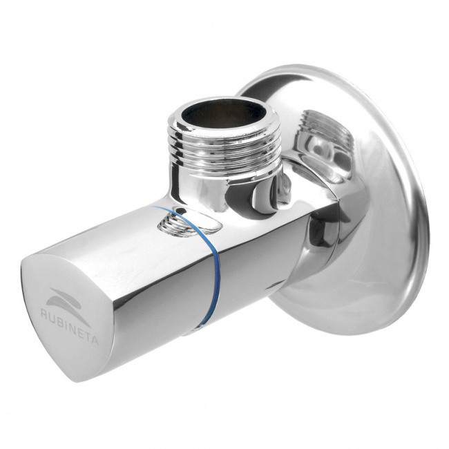 Rubineta 662016 — угловой шаровый вентиль с керамическим картриджем для подключения смесителя или WC. Изготовлен из хромированной латуни с красной или синей полоской на выбор. Резьба вентиля — 1/2х1/2.